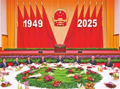 人民大会堂宴会厅华灯璀璨,洋溢着喜庆热烈的节日氛围。主席台上方高悬着庄严的国徽,“1949-2025”大字年号在鲜艳红旗映衬下格外醒目。
