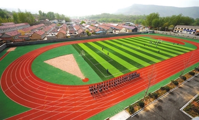 在位于山东潍坊市临朐县石家河村的临朐县弥水教育集团石家河校区,学生在操场塑胶跑道上进行体育锻炼。新华社记者 徐速绘 摄