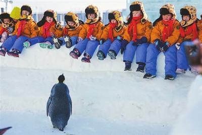 1月14日,广西“小砂糖橘”在长春冰雪新天地与企鹅互动。新华社记者 颜麟蕴 摄