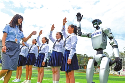 在四川师范大学附属生物城学校操场,一台人形机器人和学生一起向老师问好,祝老师教师节快乐。资料图片