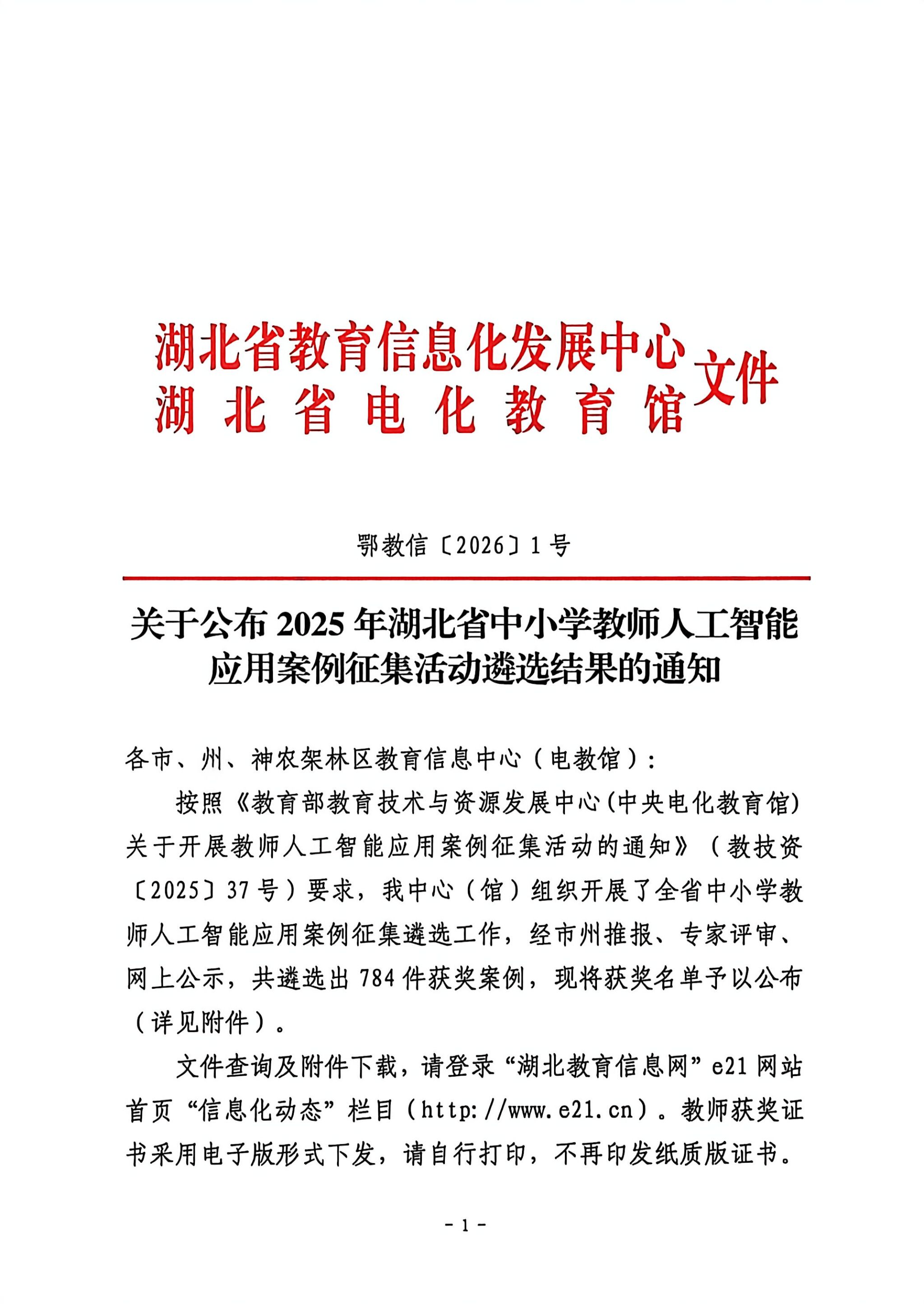 关于公布2025年湖北省中小学教师人工智能应用案例征集活动遴选结果的通知