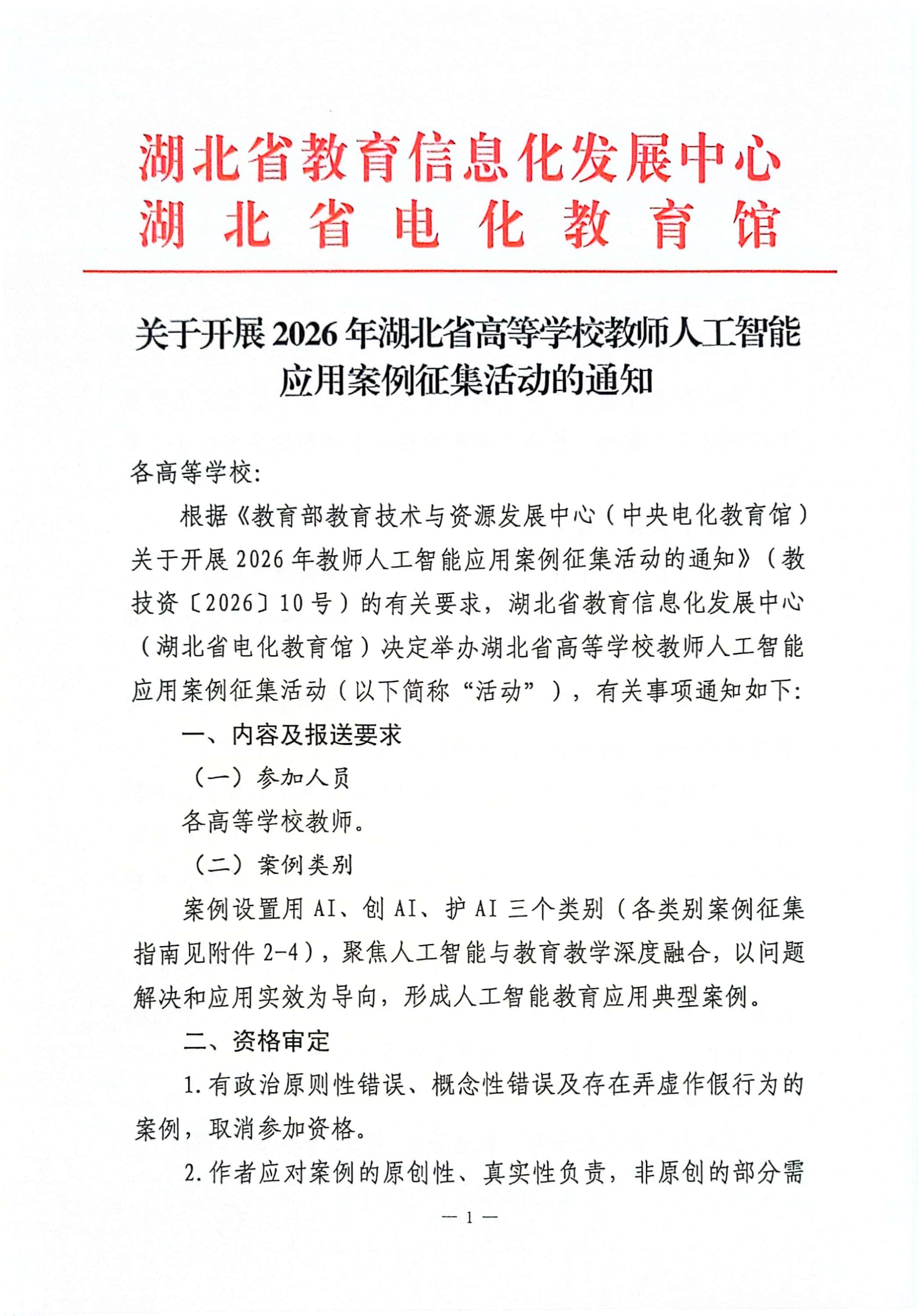 关于开展2026年湖北省高等学校教师人工智能应用案例征集活动的通知